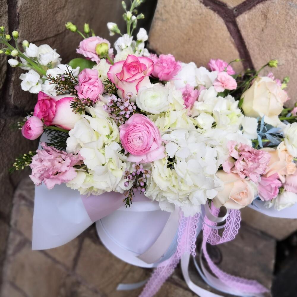 Коробка с воздушными, нежными цветами ранункулюсов, матиолы, гортензии для нежных девушек.