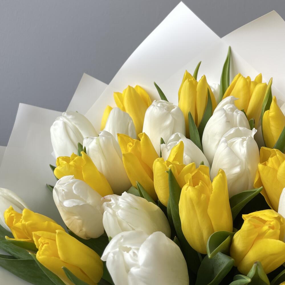 Тюльпан белый - 25 шт. Тюльпан желтый премиум - 20 шт. Дизайнерская упаковка - 1 шт.